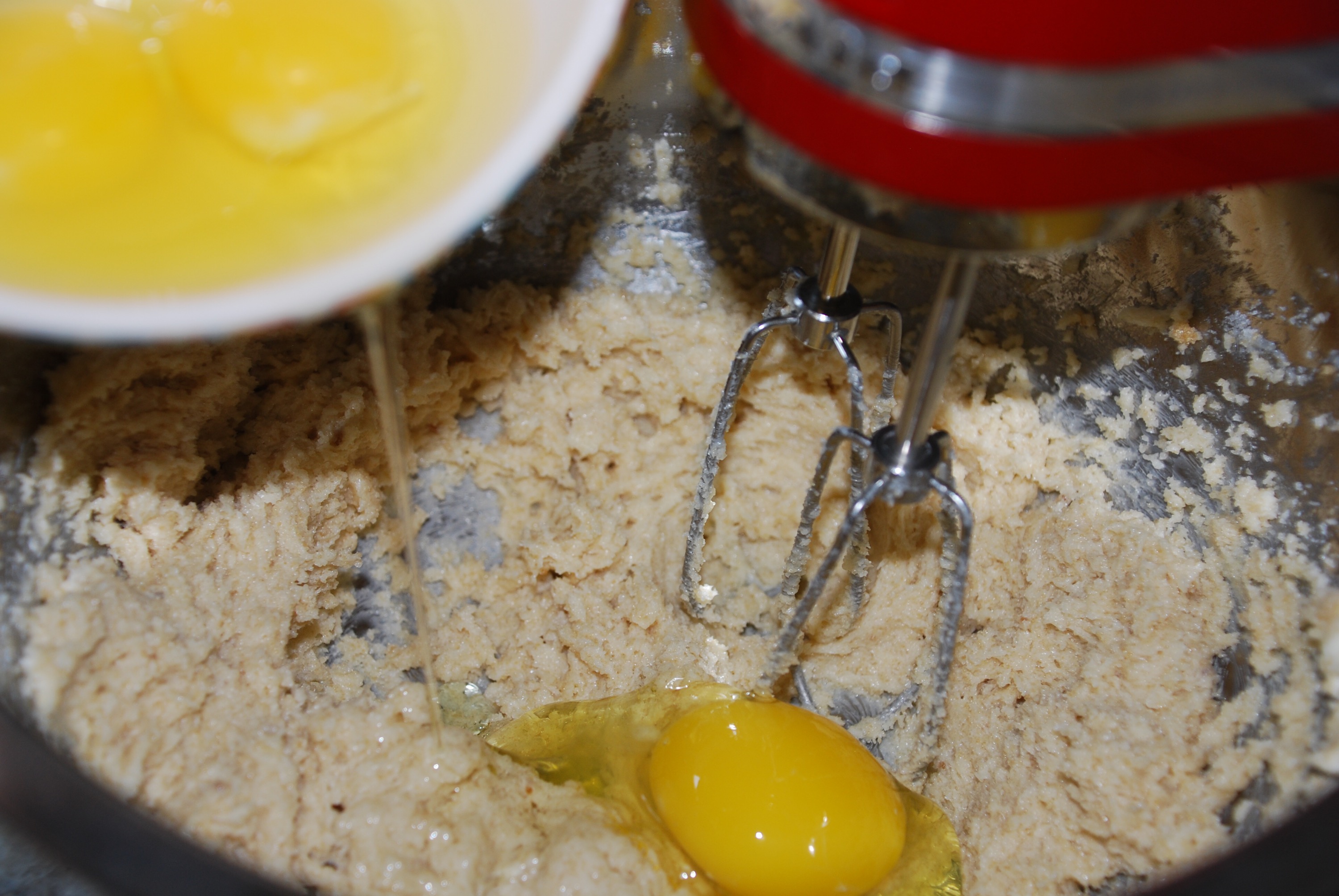 Add cracked eggs one at a time to butter/sugar mixture, beating at medium speed. Add half the flour mixture, then half of the milk. Repeat flour and then milk till all is well incorporated.