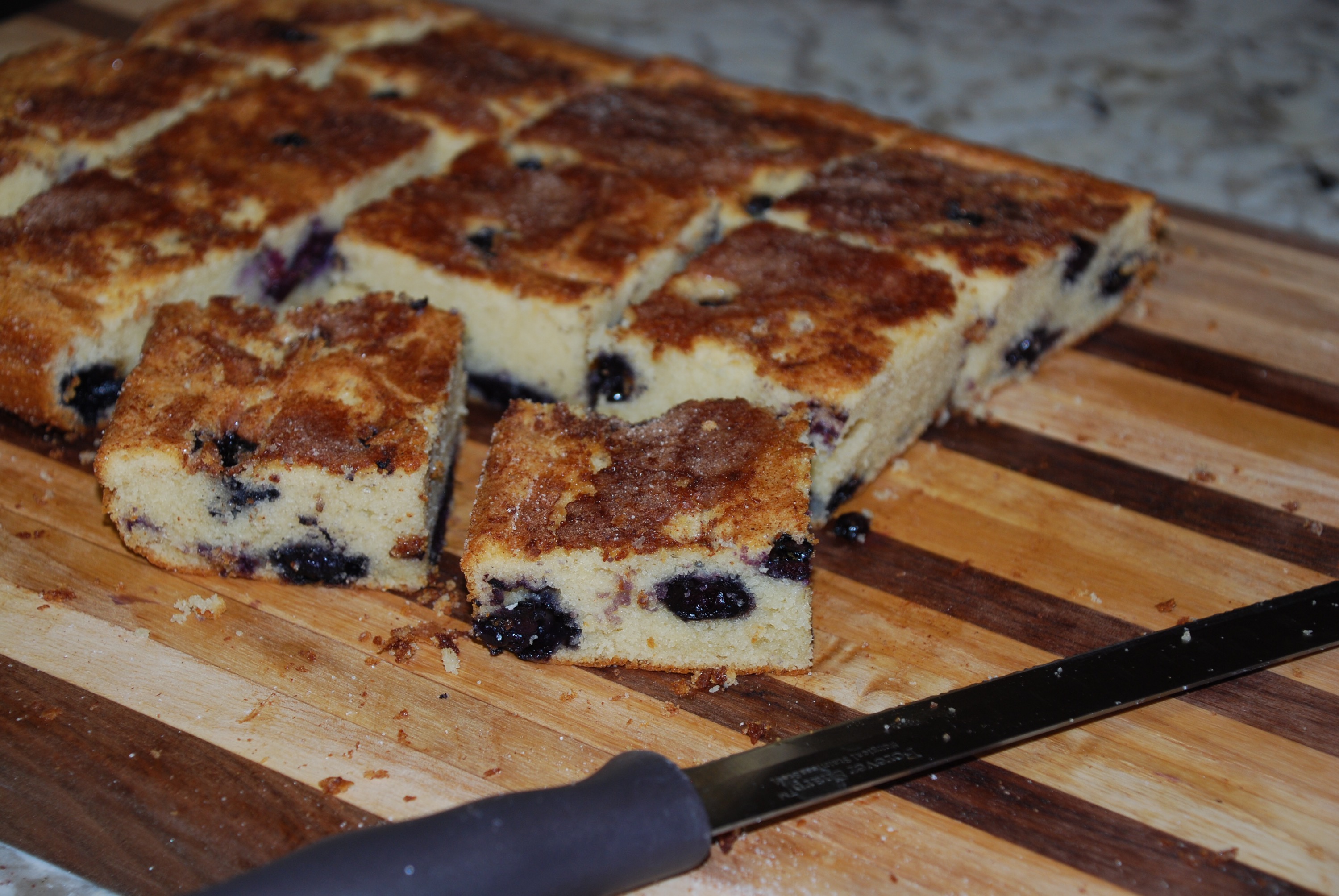 For the topping: In a small bowl, combine the sugar and cinnamon. Drop reserved blueberries evenly on top of cake batter. Sprinkle with sugar cinnamon sugar.