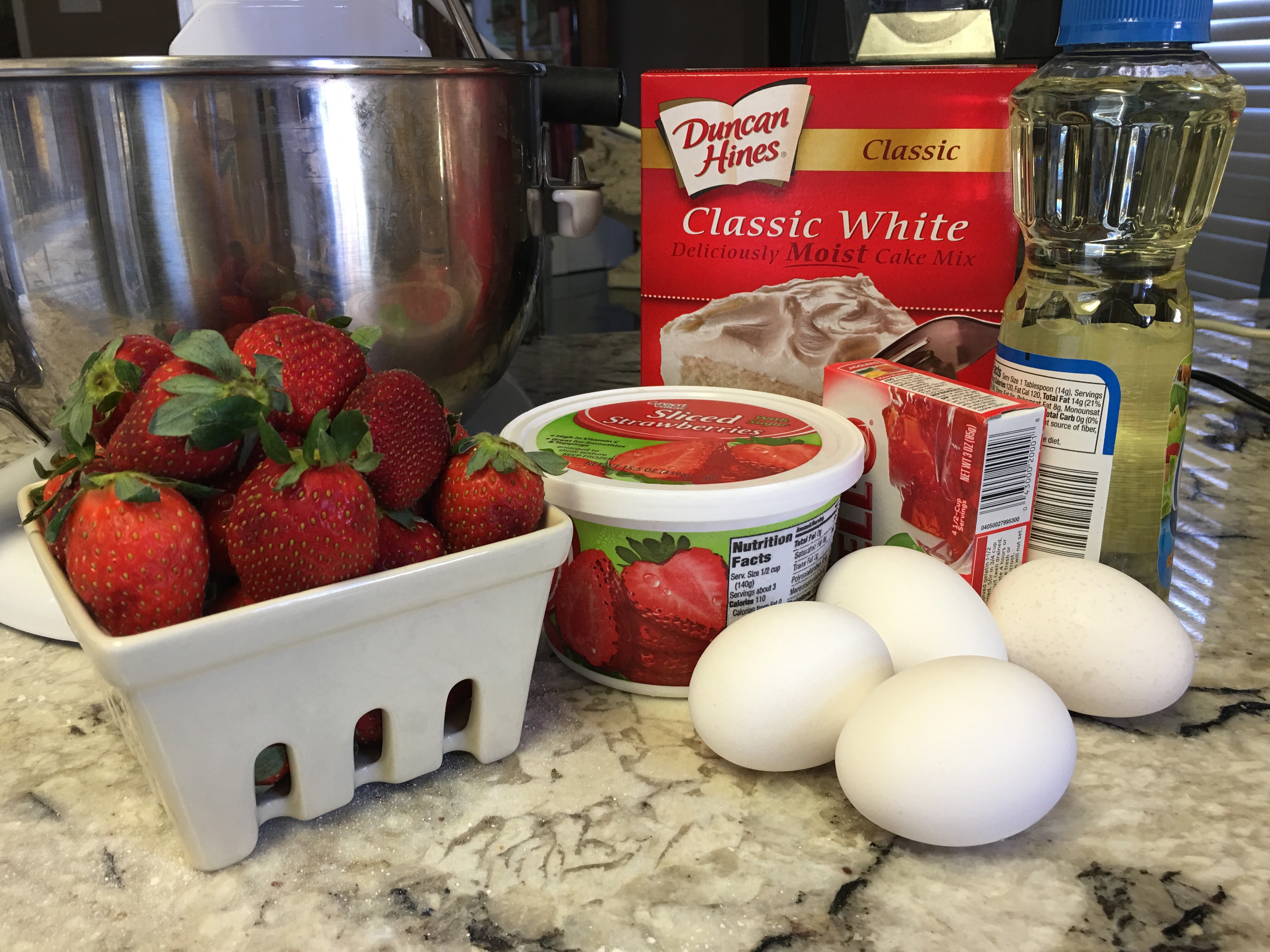 Combine cake mix and gelatin in a large mixing bowl. Add oil, water, eggs and puréed strawberries. Mix at medium speed of an electric mixer until smooth. Pour evenly into prepared pans. Bake 35 minutes or until a wooden toothpick comes out clean. (Ovens vary, so check early and often) Let pans cool 10 minutes before inverting them on a wire rack to cool completely before frosting. For the quick, light frosting...
