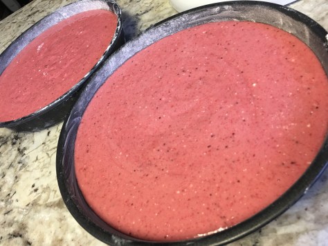 Separate cake batter evenly in two cake pans that have been lightly greased and floured.