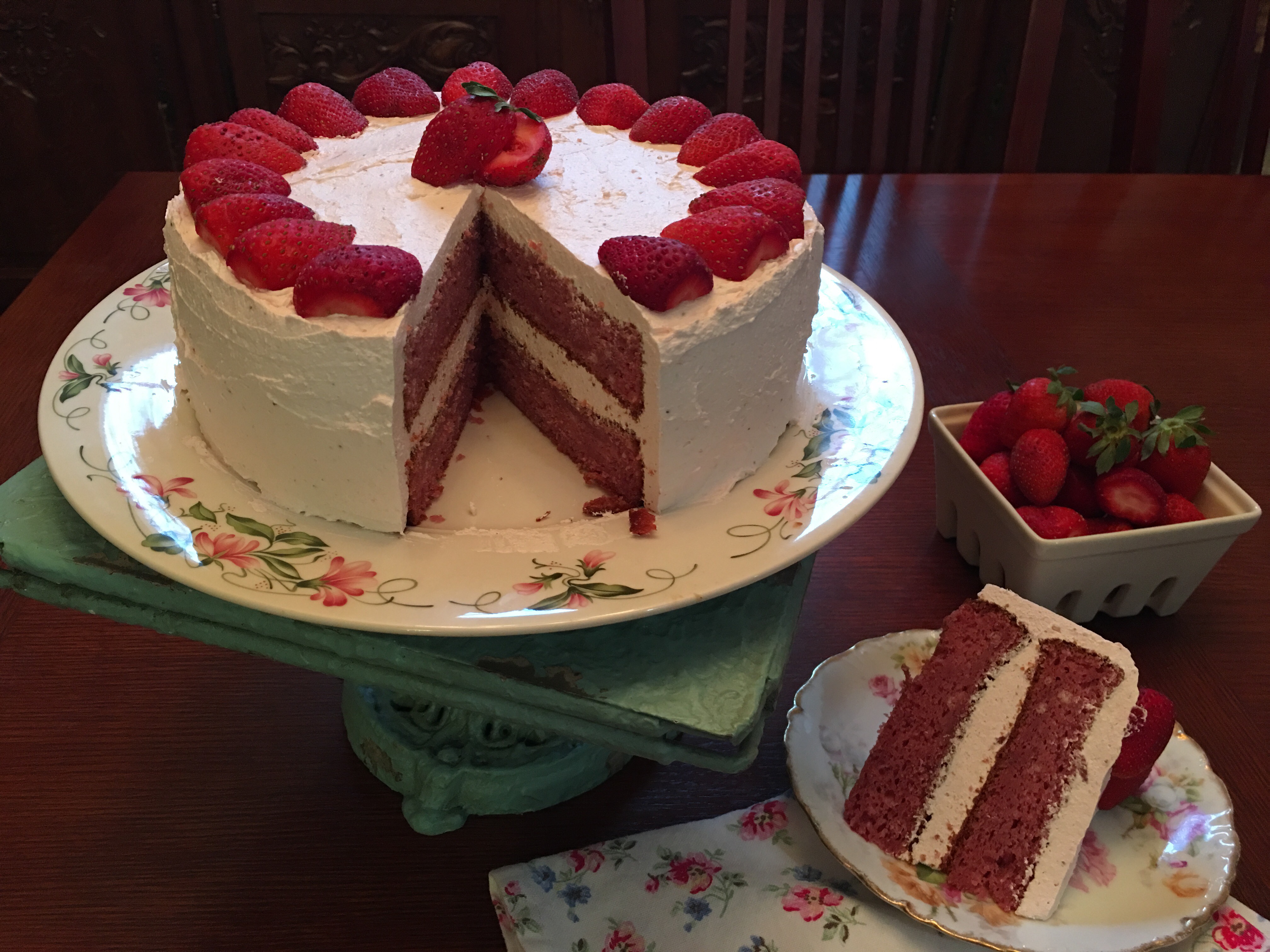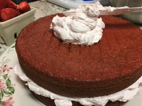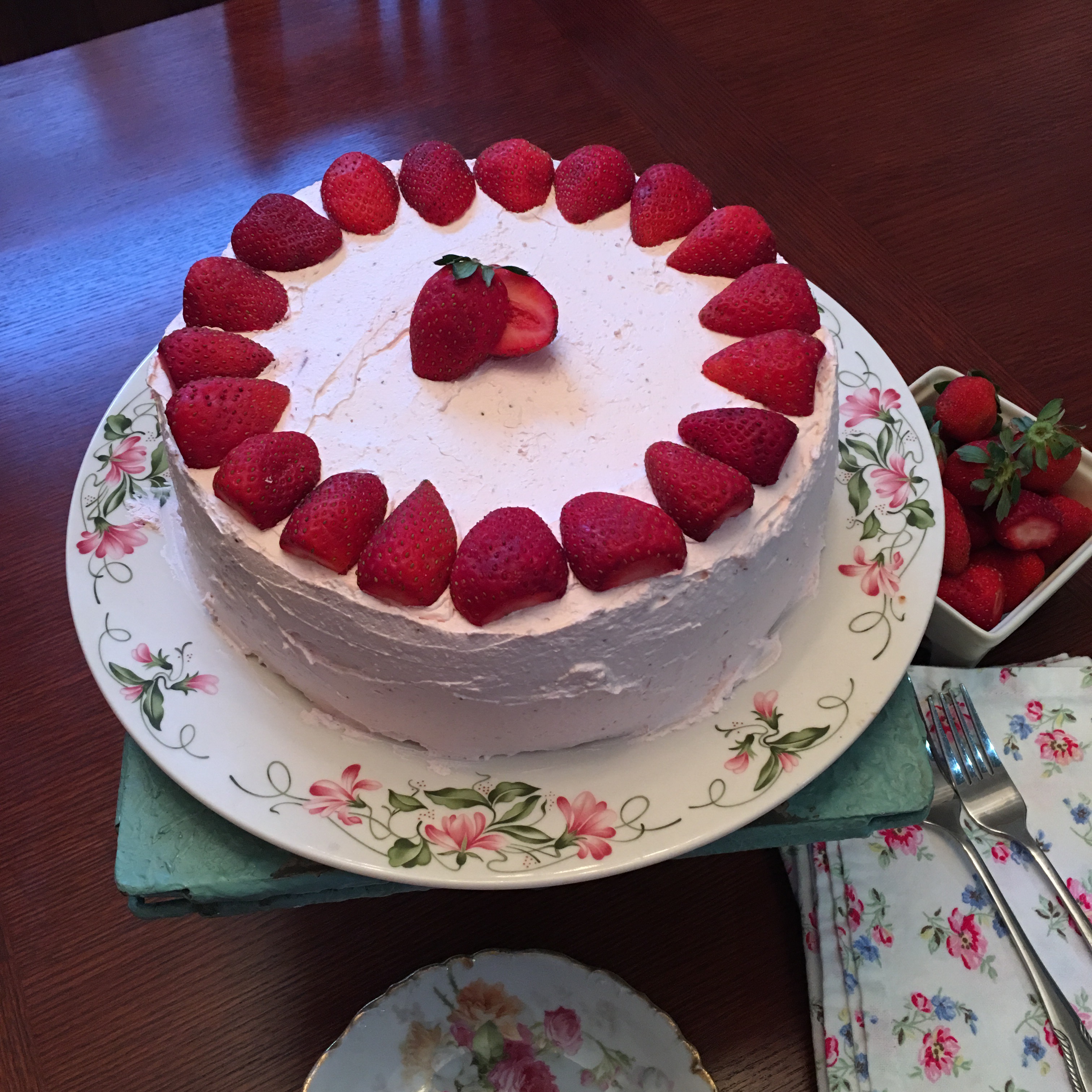 Strawberry buttercream frosting is really yummy on this cake, but this time I decided to use a refreshing Cool Whip strawberry frosting to lighten it up. By the way… The Cool Whip flavored this way is great in a trifle or just spooned into perfect cups with fresh fruit.